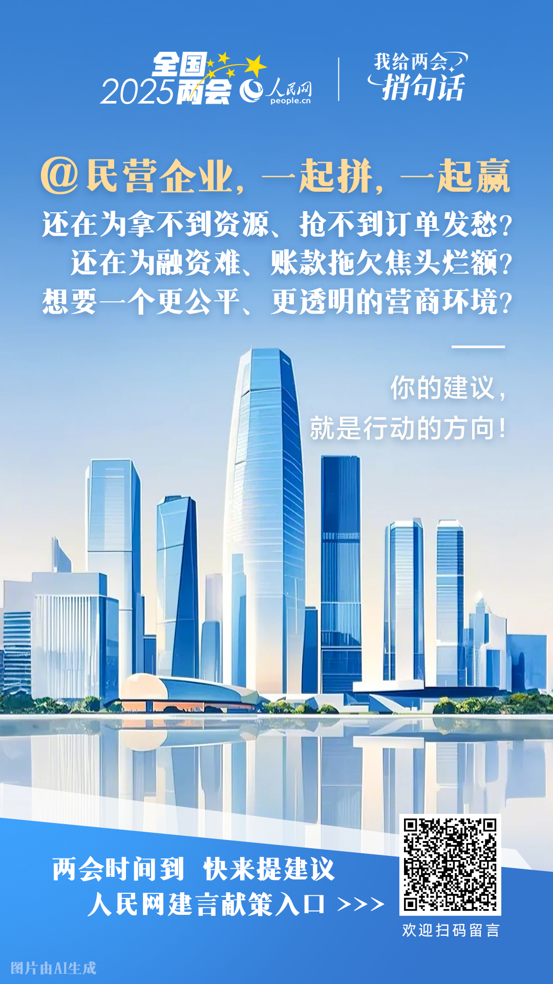 習近平總書記2月17日在京出席民營企業座談會并發表重要講話強調,新時代新征程民營經濟發展前景廣闊、大有可為,廣大民營企業和民營企業家大顯身手正當其時。人民網2025年“我給兩會捎句話”建言征集活動正在進行中,即日起,《金臺速遞》特推出全國兩會系列,摘選刊登廣大群眾和經營主體的心聲,以饗讀者。也歡迎您加入討論,一起為經濟社會高質量發展提意見建議。