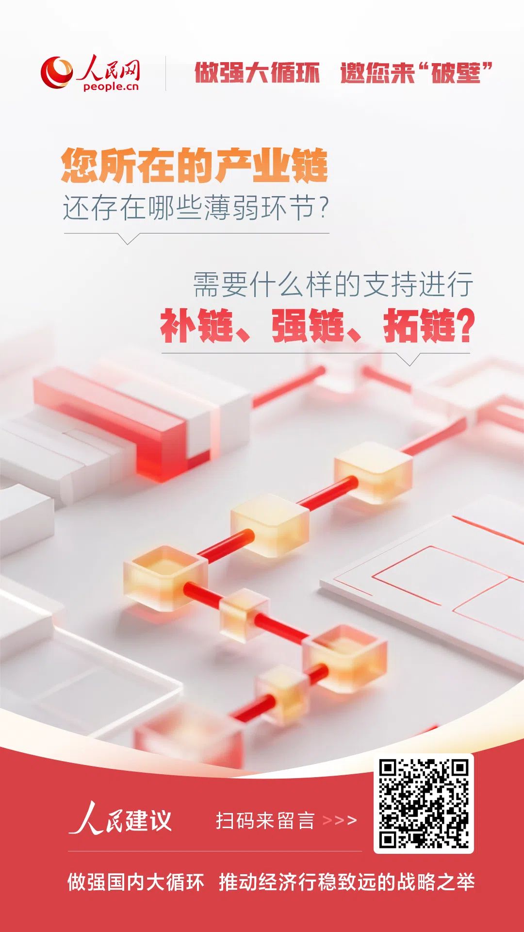 您所在的行業是否面臨關鍵材料、設備“斷供”風險?您所在的產業鏈還存在哪些薄弱環節?需要什么樣的支持進行補鏈、強鏈、拓鏈?歡迎參與人民網正在開展的“做強大循環 邀您來‘破壁’”意見建議征集,期待您的真知灼見,讓我們共同打造自主可控、韌性十足的產業體系。