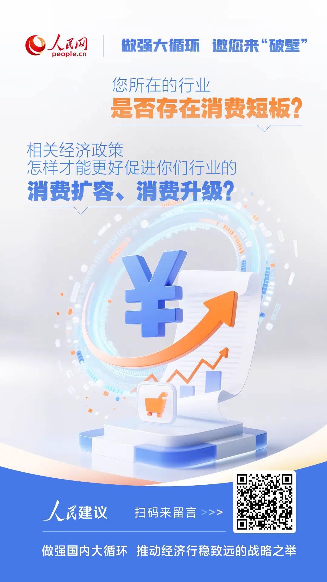 你所在的行業是否存在消費短板?相關經濟政策怎樣才能更好促進你們行業的消費擴容、消費升級?歡迎參與人民網正在開展的“做強大循環 邀您來‘破壁’”意見建議征集,你的每條留言都可能成為下一個惠民政策。